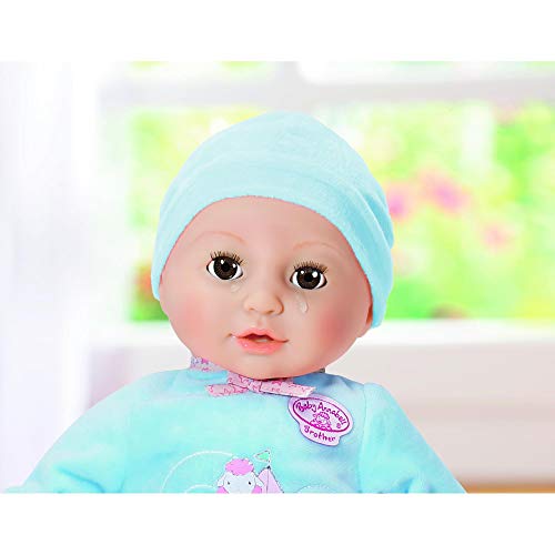 Baby Annabell Brother is just like a real baby with realistic sound and movements. He also babbles, gurgles , sucks on his bottle or dummy with real sounds and mouth movement , cries real tears, burps, yawns and falls asleep. Includes bottle, dummy, bib, nappy and cute pendant. 43cm function doll. Drinks real water. He babbles, gurgles, sucks on his bottle or dummy with real sounds and mouth movement, cries real tears, burps, yawns and falls asleep. Includes bottle, dummy, bib, nappy and cute pendant. Styles may vary. Size H43cm. Batteries required: 4 x AA (not included) plus . For ages 3 years and over. 1 year manufacturer's guarantee. EAN: 4001167794654. WARNING(S):Not suitable for children under 3 years old. Only for domestic use. To be used under the direct supervision of an adult. This toy does not provide protection.