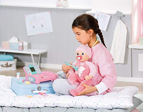 Is Baby Annabell feeling poorly? Check her with the scanner and get recommendations for the appropriate treatment to make her better again. Perfect for playing doctors and nurses with Baby Annabell! Includes lots of medical accessories. Requires batteries. Ideal for playing doctors and nurses with Baby Annabell. With working lights and sounds for a fun, interactive experience! Comes with lots of medical accessories including a stethoscope, injection, medicine spoon and many more! General information:Doll sold separately. Size H24, W37, D19cm. Batteries required: 3 x AA (not included) plus . For ages 3 years and over. Additional information:1 year manufacturer's guarantee. EAN: 4001167702451. WARNING(S):Not suitable for children under 3 years old. Only for domestic use.