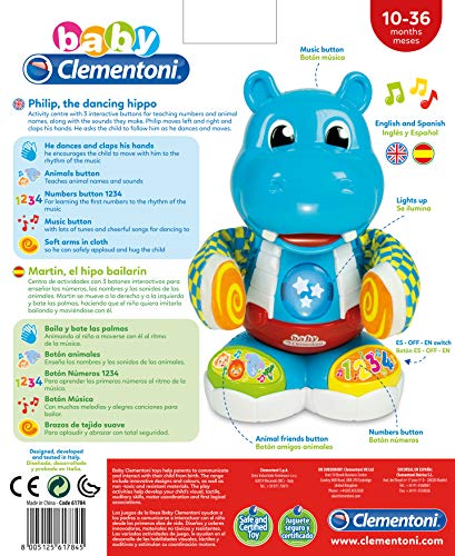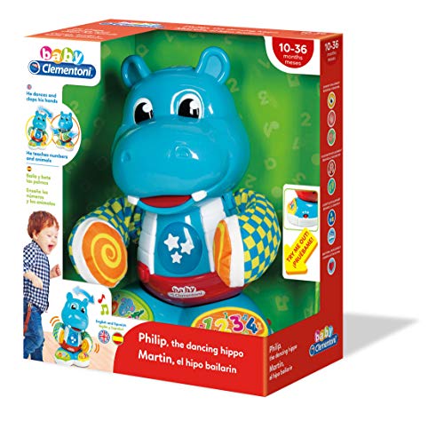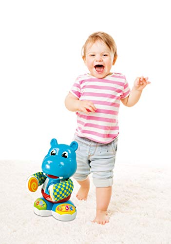 Shake it up with the dancing hippo! Designed to get kids moving and dancing so they learn easily while they enjoy themselves! This cute hippo claps his soft paws whilst he dances and invites the child to join in, to develop a sense of rhythm and motor skills. It teaches numbers and animals with lots of songs, ditties and rhymes. Size H30, W14.5, D24.5cm. Weight 820g. Batteries required: 3 x AA (included) plus . 1 assorted characters to collect – 1 supplied. For ages 10 month and over. 2 year manufacturer's guarantee. EAN: 8005125617845. WARNING(S):Only for domestic use.
