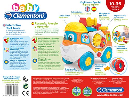 A colourful lorry and an activity suite with numerous pieces to be taken apart and tools to help little ones build up their manual skills! The engine unit with component parts on the side can be dismantled. One of the games children can play is using a screwdriver to loosen the various parts. The rear pistons move up and down when hit with the hammer. The front wheels are double-sided (with or without snow chains) and can be removed and swapped around for an adventure some time whatever the terrain! Educational Interactive Toy and Activity Centre. It has an activity button on the window for learning letters and lots of songs, rhymes and fun noises designed to help kids assimilate numbers and shapes. It includes numerous pieces to be taken apart and tools to help little ones build up their manual skills! 2 separate tools: hammer and screwdriver for playing and pretending to repair, take to bits and put back together. Size H23, W29.5, D13.5cm. Weight 910g. Batteries required: 2 x AA (included) plus . For ages 10 months and over. 2 year manufacturer's guarantee. EAN: 8005125617708. WARNING(S):Only for domestic use.