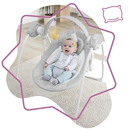 Your baby can use it right from birth, either asleep or awake. The swing can be adjusted to several positions, and has a timer (8, 15 or 30 mins) as well as 5 swing speeds. What's more, it plays gentle melodies to delight your baby. Simply use the function on the side of the swing to select one of the 12 melodies and adjust the volume. The removable toy bar stimulates your little cherub's curiosity. It can be adjusted to several positions so baby can easily reach, touch and play with the crinkly toys. Features:Really ingenious, the Badabulle Comfort swing folds down easily. It takes up very little space, meaning it is easy to store away and you can take it anywhere with you. Folds away for easy carrying, takes up little spac. Features music to sooth baby – 12 tunes. Detachable toy bar with 2 toys. Features front-to-back swinging and 5 swing speeds. Multi-position recline seat for baby's comfort; whether they are playing or taking a nap. 5 point safety harness. Support strap to keep baby secure. General information:Suitable from birth. Suitable for babies up to 9kg. Removable washable cover – machine washable at 30C. Batteries required 4 x . Size H38, W13, D60.5cm. Folds for storage. Manufacturer's 5 year guarantee. EAN: 3661276160552. WARNING(S):Only for domestic use. This toy does not provide protection.