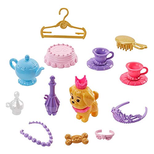4 areas in the Barbie castle offer a magical transformation to expand the play possibilities: lift the chest of drawers to reveal a doll vanity with mirror; flip down the pet seat on the wall and create a vanity with a mirror for Honey puppy; release the princess throne to fold out into a bed (with soft rainbow-print blanket) for Barbie doll and her pet (doll sold separately); and send Honey puppy up to the rooftop by lifting the cloud-shaped platform.