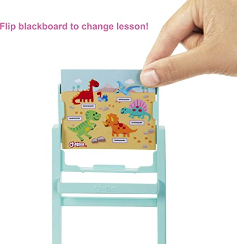 A classroom area inspires storytelling with desk and chair sets for Chelsea and a friend (sold separately) and a flipping blackboard with fun graphics