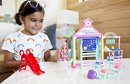 Chelsea and her friends inspire young minds to explore the world. Just like big sister Barbie, they love to try new things, challenge themselves and have fun. This Barbie Club Chelsea School playset is the perfect place for young minds to explore the classroom and beyond! Sweet schoolhouse decorations, storytelling accessories and multiple play areas inspire imaginative fun. Barbie Club Chelsea dolls and toys inspire imaginations to explore the world with fun themes kids love – like this Chelsea school playset with multiple play areas and pieces that can be arranged and rearranged for storytelling fun! A classroom area inspires storytelling with desk and chair sets for Chelsea and a friend (sold separately) and a flipping blackboard with fun graphics. A cafeteria space features a lunch counter with a cash register and lunch trays, so Chelsea doll can grab a snack before recess. When it's time to play, send her down the slide or clip her into the swing and push! With so many themed play pieces, like notebooks, juice boxes, school supplies, a backpack and pair of glasses for Chelsea, imaginations can play out endless school stories. Chelsea is ready for class in a top with a sun graphic, a removeable skirt with bright rainbow print and casual white shoes. General information:Size H26.67, W39.37, D30.48cm. For ages 3 years and over. Additional information:1 year manufacturer's guarantee. EAN: 887961803495. WARNING(S):Not suitable for children under 3 years old. Only for domestic use. To be used under the direct supervision of an adult. To prevent possible injury by entanglement remove this toy when the child starts trying to get up on its hands and knees into a crawling position.