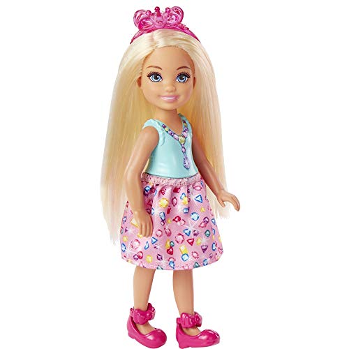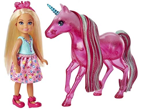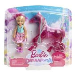 Kids will want to hop on and let their stories take off. Chelsea doll is ready for adventure in a colourful outfit that celebrates the gem-filled kingdom: a necklace is detailed on her teal bodice, a colourful gemstone print decorates her pink skirt, her pink shoes have bows and a pink bow headband tops the sparkling look. Let your dreams fly with Chelsea doll and a unicorn from Barbie Dreamtopia Sparkle Mountain! The pink unicorn shimmers with a glittery, translucent body and a teal horn with swirl pattern. The unicorn's mane and tail are so pretty with long pink and teal streaks. Chelsea doll wears a look inspired by the gem-filled land with a removable skirt, pink shoes and a matching headband with bow. Collect all of the Barbie Dreamtopia dolls and accessories and let your stories take flight (each sold separately, subject to availability). For ages 3 years and over. 1 year manufacturer's guarantee. EAN: 887961611519. WARNING(S):Not suitable for children under 3 years old. Only for domestic use. This toy does not provide protection.