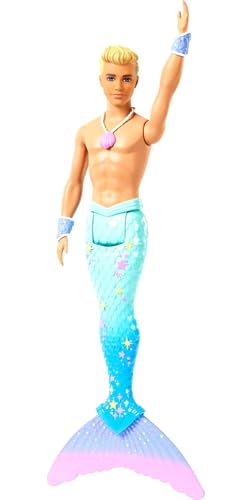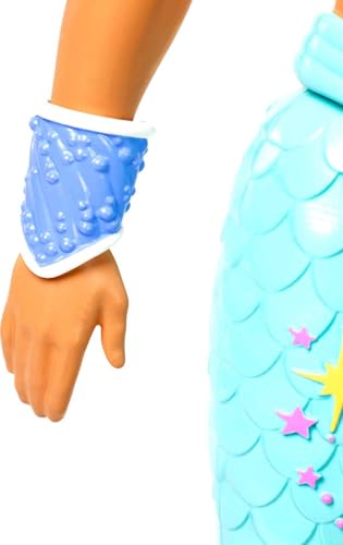 Barbie Dreamtopia merman and mermaid dolls inspire imaginations to dive into fairytales — each has a tail with fantasy decorations themed to candy, gems or rainbows. Barbie merman's tail is coloured in rainbow shades of blue, purple and pink. He accessorizes with a shell necklace and wrist gauntlets. Make a splash with Barbie merman doll from Barbie Dreamtopia! His tail and fin are coloured in ombre shades of blue and purple and a hint of pink; colourful stars and a scale-pattern add more fantasy touches. Accessorise him for undersea occasions or watery adventures with a "pearl" string necklace with pink seashell and blue and white wrist gauntlets. Barbie merman doll bends at the waist so kids can pretend he's "swimming" in the sea or sit him up to soak up the sun! The unique doll makes a great gift to add to any fairytale lover's doll collection! Size H35.56cm. For ages 3 years and over. 1 year manufacturer's guarantee. EAN: 887961699005. WARNING(S):Not suitable for children under 3 years old. Only for domestic use. To be used under the direct supervision of an adult. To prevent possible injury by entanglement remove this toy when the child starts trying to get up on its hands and knees into a crawling position.