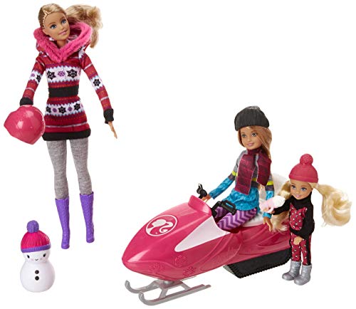 Barbie, Stacie and Chelsea dolls are dressed in seasonal clothing and come with a snowmobile for Barbie doll and a snowman for Stacie doll and Chelsea doll, plus a hot cocoa to warm them up. Play out all kinds of snowy adventures and family bonding moments. Make every day a winter adventure with Barbie, Stacie and Chelsea together in one pack! Barbie can ride her snowmobile any time – just put on her pink helmet and she's ready to go! Stacie and Chelsea can build a snowman – he even has a hat! Barbie is bundled up in a colourful sweater that has a hood with "furry" trim. Stacie is ready for the cold in a colourful top, graphic print leggings, pink boots, a scarf and black hat. For ages 3 years and over. 1 year manufacturer's guarantee. EAN: 887961475715. WARNING(S):Not suitable for children under 3 years old. Only for domestic use. To be used under the direct supervision of an adult. To prevent possible injury by entanglement remove this toy when the child starts trying to get up on its hands and knees into a crawling position.