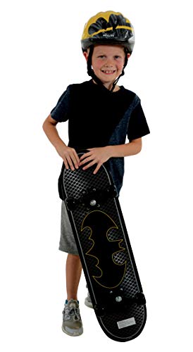 Batman Skateboard with cool graphics and printed griptape. 79cm x 20cm (31" x 8") double kicktail maple deck. Colour printed griptape. PP Trucks. 608z bearings. PVC Wheels. Age 5+ years. Made of wood. PP Trucks. 608z bearings. W79, D20cm. Maximum user weight: 50kg. 1 year manufacturer's guarantee. For ages 5 years and over. EAN: 5017915215110. WARNING(S):Not suitable for children under 3 years old. Only for domestic use. To be used under the direct supervision of an adult. Protective equipment (helmet, knee pads, elbow pads and wrist guards) should be worn, not to be used in traffic. This toy does not provide protection.
