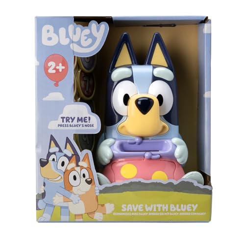 Save with Bluey helps develop counting skills with 10 different play coins to put into Bluey’ purse. Hear the different sound effects play as you bank each coin and celebrate as you save, save, SAVE! Open Bluey’ purse to start all over for endless fun. Press Bluey’ nose to hear the classic Bluey Theme tune. Shaped just like Bluey from the show! Includes 10 numbered coins. Insert coins to hear different sound effects and character sounds. Simply open the purse to retrieve the coins and start all over again! Press Bluey’ nose to hear the Theme Tune. Learning Skills:Hand and Eye Coordination. Problem Solving. Auditory. Imagination. Dimensions:Size H17, W11.6, D10cm. Weight 600g. Packaged Size: H20, W17.5, D10.5cm.General Information: Batteries required: 2 x AAA (included). Care instructions: wipe clean. For ages 18 months and over. EAN: 5050868493112. WARNING(S):Only for domestic use. To be used under the direct supervision of an adult.