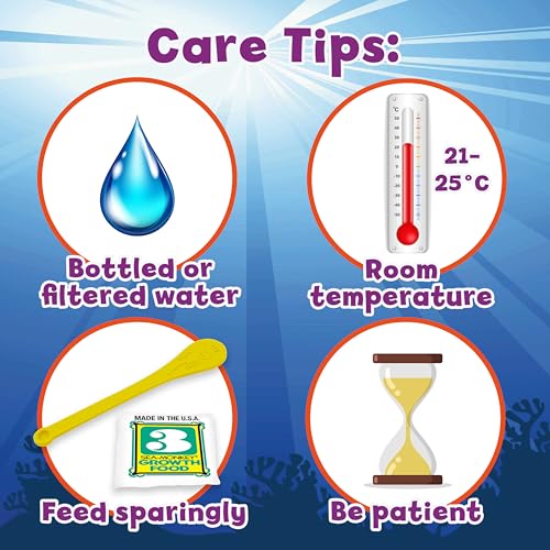 • STAGES | Growing these water pets for kids is simple and easy: first add the water purifier to your toy aquarium, then the eggs, and from day 5 start providing the sea monkey food. Watch them grow and swim as they frolic in their watery home.