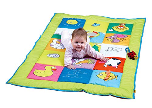 This huge, double-sided, soft baby mat gives your baby one side for playing, with colourful and stimulating pictures, baby mirror, multiple textures and attached lady bug pal. The flip side is for calming your baby down and only shows a picture of the lady bug pal heading to sleep. The extra large playmat is large enough for twins or more. Includes baby mirror to encourage self identification and fun. Also includes lady bird toy and multiple textures, for mental stimulation. Suitable from birth. Size H2, W150, D100cm. Folds for easy storage. Playmat care instructions: wipe clean only. Toys care instructions: hand wash only. Manufacturer's 1 year guarantee. EAN: 7290011321833. WARNING(S):Only for domestic use.