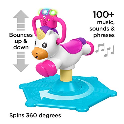 Get ready for magical learning fun with the Bounce and Spin Unicorn from Fisher-Price! Featuring a sturdy base, easy-grip handles, interactive buttons and multicolour lights, this stationary ride-on unicorn plays songs, whimsical sounds, and educational phrases as your baby bounces up and down or spins all around!Baby walker features:For ages 12 months and over. Manufacturer's 1 year guarantee. EAN: 887961806229. WARNING(S):Only for domestic use.