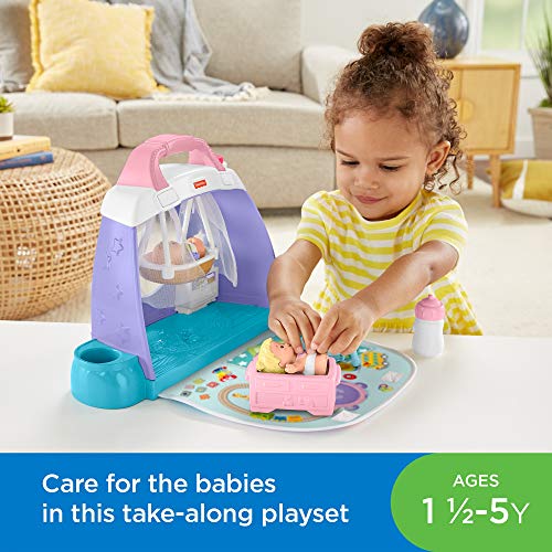- ​Toddlers can play and care for their Little People baby figures with this nursery play set that folds to look like a diaper bag!