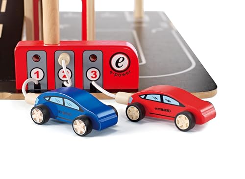 MULTI-LEVEL FUN: Includes two wooden toy cars, a helicopter and three electric car recharging stations.