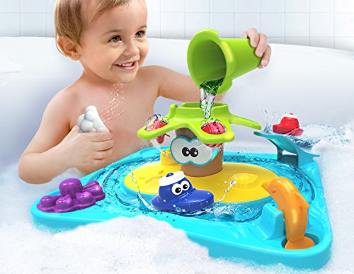 The entire island floats in the bath tub, and a variety of engaging features start to introduce kids to early STEM concepts like water power and cause and effect