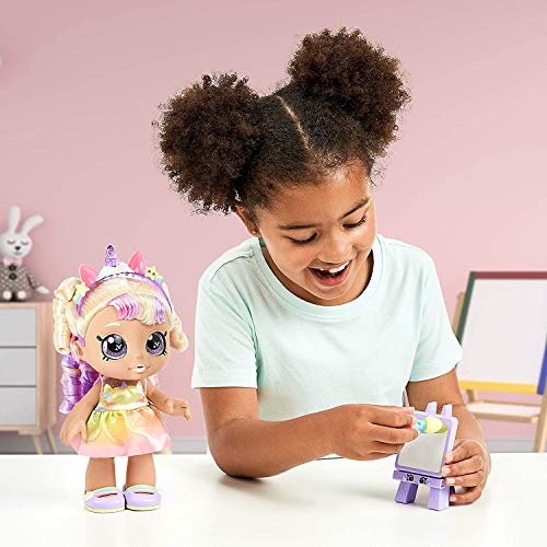 Kindi Kids "Fun Time Friends" are the cutest Pre-Schoolers around! These adorable little girls are full of fun and play and they love attending Rainbow Kindi – A place where every day is about playing together and making friends! Mystabella is a beautiful little girl who loves dressing up as a Unicorn Princess! With a cute unicorn horn headband and a colorful dress, she loves being artistic! She can hold her paintbrush in her hand. Dip her paintbrush on cold water and brush her canvas on her Shopkins easel and magically see her painting appear. Pre-school Kindi Kids 10 inch doll, and 2 Shopkin Accessories. Mystabella loves to create and comes with a "Magic Reveal Masterpiece"! Dip my paintbrush in cold water and brush the canvas to see my painting magically appear! I can hold my paintbrush! My head wobbles and bobbles! Size H25.3, W14.1, D10.1cm. Weight 890g. For ages 3 years and over. 1 year manufacturer's guarantee. EAN: 630996500613. WARNING(S):Not suitable for children under 3 years old. Only for domestic use. To be used under the direct supervision of an adult.
