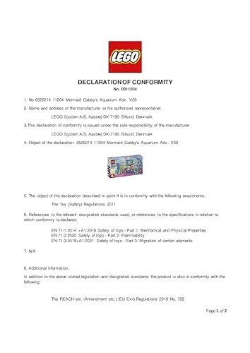 LEGO Gabby’ Dollhouse Mermaid Gabby’ Aquarium Adventure is a colourful sea-life toy that provides endless build-and-play fun for kids aged 4 and over. LEGO® model number: 11204 – for ages 4 years and over. Theme: LEGO Gabby’ Dollhouse. Gabby’ Dollhouse toy for kids – Fans of DreamWorks Animation’ Gabby’ Dollhouse can join their favourite kitty pals for fun with Mermaid Gabby’ Aquarium Adventure toy for 4+ year old girls and boys. Creative building toy – This LEGO 4+ set has a Gabby mini doll in a mermaid outfit, MerCat and Jellyfish Gabby’ Dollhouse figures plus a Starter Brick for speedy assembly. Doll’ house accessories – There’ lots to discover, including shells, plants, sea life, a slide, a giant bubble that the characters can 'float' in, and coral that moves to reveal a treasure chest. Expand the fun – Kids can supplement this building toy with set 11205 (sold separately) to create the three expansive worlds depicted in the movie. Birthday gift for kids – This LEGO Gabby’ Dollhouse toy makes a fun gift for 4+ year old girls, boys and fans of DreamWorks Animation’ Gabby’ Dollhouse: The Movie. This versatile LEGO playset measures over 15 cm (5.5 in. ) high, 23 cm (9 in. ) wide and 7 cm (2.5 in. ) deep. We are on a mission to breathe new creative life into old LEGO bricks and ensure no brick goes to waste. LEGO Replay gives new life to used bricks by rehoming and repurposing LEGO bricks to good causes. So why not donate your bricks and allow others to reimagine, rebuild and replay. Includes 103 pieces. Dimensions:Box size H6.1, W14.1, D26.2cm. General Information: For ages 4 years and over. EAN: 5702017813455. WARNING(S):Not suitable for children under 3 years old. Only for domestic use.