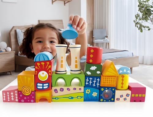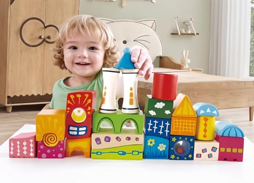 Hape Fantasy Castle blocks with twenty two distinctive and colourfully decorated wooden block shapes can take your building skills to new levels. Aim high and create a dream castle with arches, turreted towers, portholes and spires. Not forgetting the beads that rattle in the eaves. Helps to develop colour and shape recognition and co-ordination. Made to Hape environmentally friendly and high quality standards. Size H18, W9, D42cm. Weight 750g. For ages 19 months and over. 1 year manufacturer's guarantee. EAN: 6943478002654. WARNING(S):Only for domestic use.