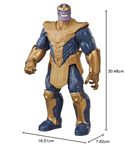 The evil warlord Thanos will stop at nothing to spread his reign of tyranny across the universe. With this classic-inspired line of toys, children can imagine the heroic action as Hulk, Iron Man, Captain America and the rest of the team faces off against Thanos, the greatest threat to the universe. Each product sold separately. Imagine the villainous warlord threatening earth with this Thanos figure from the Titan Hero Series! When kids connect the Titan Hero Blast Gear launcher to this figure's back port, they can launch projectiles! Imagine the terrible Titan warlord threatening earth with this 30-cm-scale Thanos figure, inspired by the classic character design from the Marvel comics. Fans can imagine the Mad Titan Thanos battling heroes in a fight for the fate of the world with this Thanos figure, inspired by the character from the Marvel comic books. Connect the Blast Gear launcher (sold separately) to the back port or arm port on Titan Hero Series and Titan Hero Blast Gear figures to launch projectiles with the push of a button. Be on the lookout for other Avengers figures and gear to imagine the brave heroes defending the world from the evil Thanos! Additional products each sold separately. Subject to availability. Size H30.5cm. For ages 4 years and over. Manufacturer's 1 year guarantee. EAN: 5010993653775. WARNING(S):Not suitable for children under 3 years old. Only for domestic use. To be used under the direct supervision of an adult.