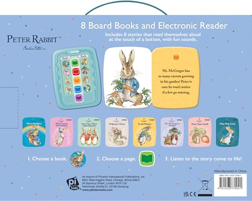 -30%Little ones love listening to these stories and rhymes, all read aloud at the touch of a button! Standalone electronic pad resembles an Ereader and Includes 8 books. Electronic Look & Find reader and 8 book library. Choose a book, choose a page and listen to the story come to life! Includes 8 rhyming books that read themselves aloud at a touch of a button, with charming narration, silly sounds, and songs! Box contains 8 board story Books and an electronic E reader to read all the stories out loud. Following along in the book while listening to the narration is an important first step toward independent reading. Features all your favourite chracters from the World of Peter Rabbit, from one of the most famous children’ authors of all time, Beatrix Potter. Book Titles include: Peter’ Rainbow, Who Lives in the Garden, One, Two, Three Little Bunnies, Helping At Home, To the Market, Mr McGregor’ Garden, Hear, Taste, Smell & Hop, Skip, Jump. Size H20, W28, D6cm. Batteries required: 3 x AAA (included) . For ages 6 months and over. EAN: 9781503770041. WARNING(S):Only for domestic use. This product contains NO.