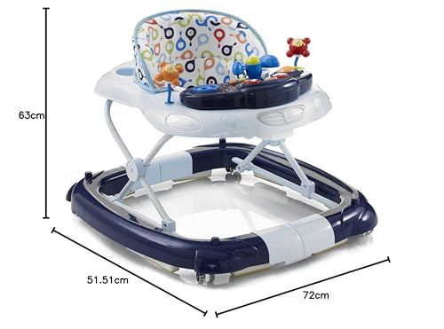 It really doesn't get much better than this; a fabulous musical play tray, walker and rocker all in one. Baby walker features:Suitable from 6 months with 3 height adjustments to accommodate those growing leg; and handily folds flat for storage. Removable extra soft padded seat to support baby while they play and move around. Quickly and easily converts to a rocker with supportive foot pad for rocking mde for extra static play time. Play tray with toys, lights and sound. Plus removable toy car with it's own lights and sounds. Speed restricting wheel and no-tip safety pads. Back support for baby's comfort. 3 height positions. Size H51.5, W72, D63cm. Weight 5.5kg. Suitable for babies up to 11kg. Batteries required: 2 x 1.5V (not included) plus . For ages 6 months and over. Manufacturer's 3 year when registering online guarantee. EAN: 5036549890210. WARNING(S):Only for domestic use. To be used under the direct supervision of an adult. This product contains no.