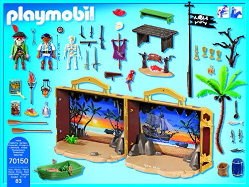 Take the fun of the Pirate Island with you everywhere with the PLAYMOBIL 70150 Take Along Pirate Island. All included pieces fit inside the handy carry case for easy transportation. The set features a boat which floats on water, 2 Pirates with their parrot friend and many accessories such as treasures, a hog roast and a table to enjoy a feast at.