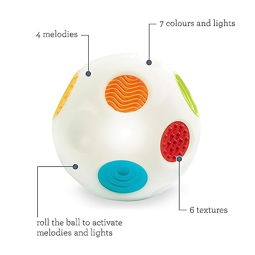 This soft sensory ball, is a clever little fella with lovely textured areas for sensory learning. Teaches little one colours and plays 4 catchy melodies. 7 colours, lights and 6 textures to discover. Baby will love to manipulate this ball, throw it and roll it. When it stops it will change colour and identify the colour. Lots of teethetastic sensory fun. Delightful rainbow light ball with 7 colours & 4 catchy melodies. Roll the ball & watch it stop, when it stops the ball changes colour & identifies verbally. 6 sensory textures to develop motor skills. Teaches colours. Size H20.3, W14, D16cm. Weight 0.25g. Batteries required: 3 x button cell (included) plus (not included). For ages 9 months and over. 1 year manufacturer's guarantee. EAN: 3021105052173. WARNING(S):Only for domestic use.
