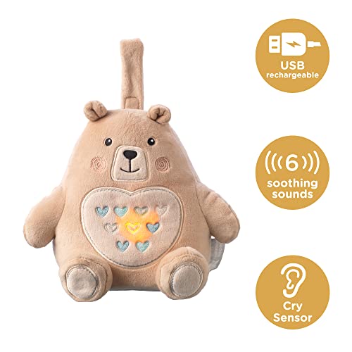This cute and cuddly night-time companion will help you and your baby get a good night's sleep. With a soft heart shaped light, soothing sounds and gentle lullabies your little one will be reassured as they go to sleep. During the night, the intelligent CrySensor listens out for any crying noises and plays your chosen sound or lullaby to help them drift back to sleep. Now there's no need for batteries to keep your bedtime pal listening out through the night as it's is rechargeable using a USB mains powered cable to stay alert. 85% of babies sleep better with a Tommee Tippee light and sound sleep aid*. Bennie the bear is a cute and cuddly night-time companion which will help you and your baby get a good night's sleep. *Source: 222 UK respondents, feedback survey August 2018. USB Rechargeable – Our light and sound sleep aid are now rechargeable with a USB lead meaning no need to keep replacing expensive batteries, saving you money! . Intelligent CrySensor technology – If baby cries, Bennie will respond by playing 20 minutes of soothing sounds/ lullabies to help settle your baby. The CrySensor will listen for baby's cry for 3 hours, then automatically switches off. 6 natural soothing sounds – You can choose to set Bennie the bear to play any of 6 great natural soothing sounds. These sounds include a comforting heartbeat, rainfall, white noise or any of 3 lullabies. Controllable Night Light – You can set the Dimmable light inside Bennie the bear tummy which automatically switches off after 30 minutes to save energy. You can also control the sound or lullaby volume or turn it off altogether. General information:Size H14.8, W18, D22.5cm. Suitable from birth. Batteries required: 1 x rechargeable (included) plus 1 x rechargeable (included)(not included). Manufacturer's 1 year guarantee. EAN: 5055531059930. WARNING(S):Not suitable for children under 3 years old. Only for domestic use.