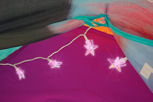 Suitable from 3 years and featuring beautiful character graphics, this is the perfect den for children as they start to explore imaginative play and independence. The My Dream Den features 2 modes; during the day, simply slide in the poles to erect to create a perfect den for kids to immerse themselves in play! At night the Dream Den comes complete with an inflatable mattress which quickly inflates and easily slips inside the base to create a bed. Perfect for naps and sleepovers! Each Dream Den also includes a set of 10 magical, star shaped fairy lights for that soft night time glow. With closed top, integrated floor and durable polyester and PVC materials as well as water and UV resistance; play can continue come rain or shine, inside or outside. Simple tie back to the front flaps allow for both open play or closed for secret hide-always and naps! The tent is one-piece design which is shaped by inserting the pre-fixed elastic snap action poles through readymade channels and at the end of the day, the whole product folds down to compact, light size for easy storage. It also comes with a carry bag ideal for transporting to slumber parties! Suitable for indoor and outdoor use. Folds for storage. Size H90, W150, D90cm. Weight 2kg. Self-assembly. Made of polyester. Batteries required: 2 x AA (not included) plus . 1 assorted characters to collect – 1 supplied. For ages 3 years and over. 1 year manufacturer's guarantee. EAN: 5017915001720. WARNING(S):Not suitable for children under 3 years old. Only for domestic use. To be used under the direct supervision of an adult. To prevent possible injury by entanglement remove this toy when the child starts trying to get up on its hands and knees into a crawling position.